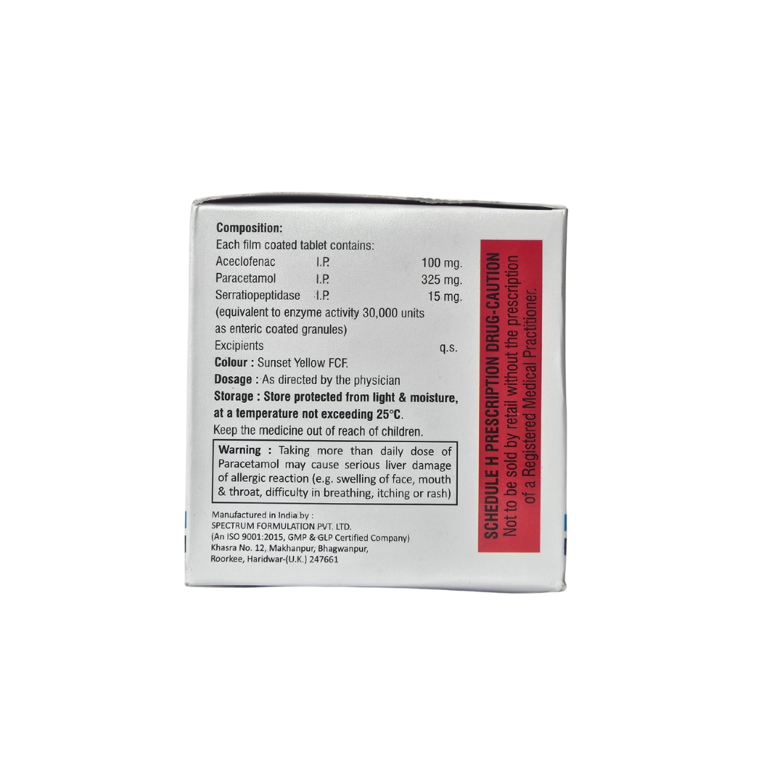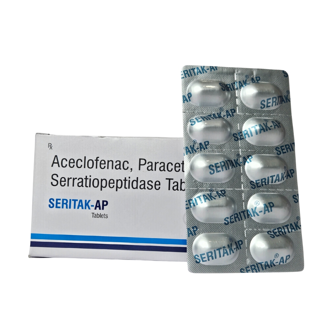 Seritak-AP Tablet is a combination of three medicines: Aceclofenac, Paracetamol, and Serratiopeptidase.