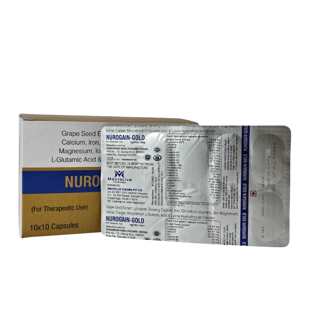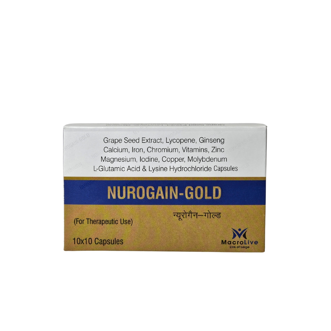 NUROGAIN-GOLD Capsule is a multivitamin and mineral capsule that helps ensure proper growth and development of the body. It is suitable for prophylactic acid and helps prevent the spread of diseases and infections.