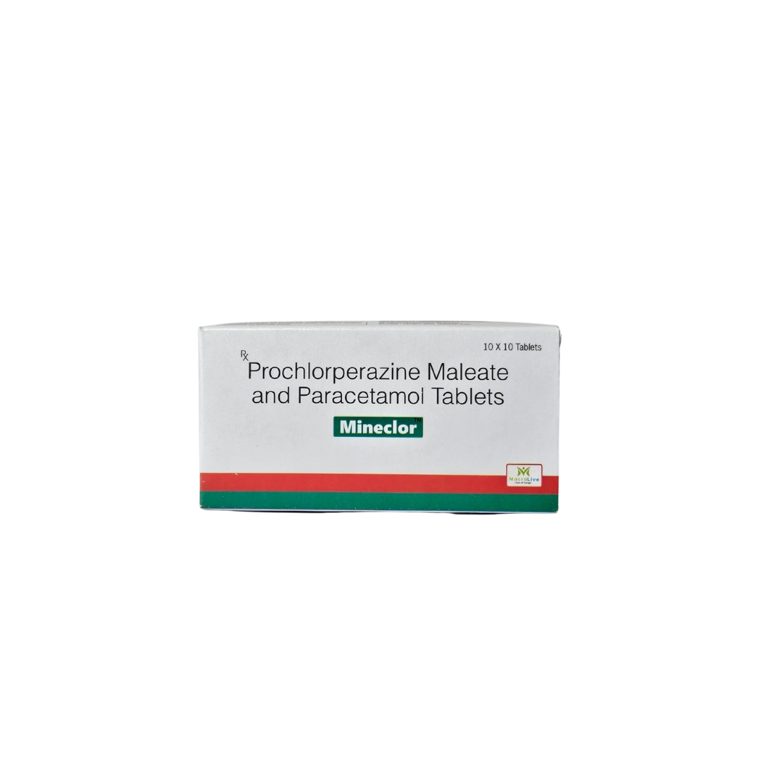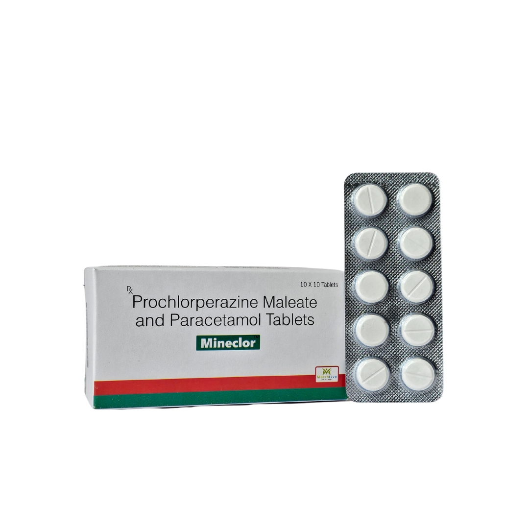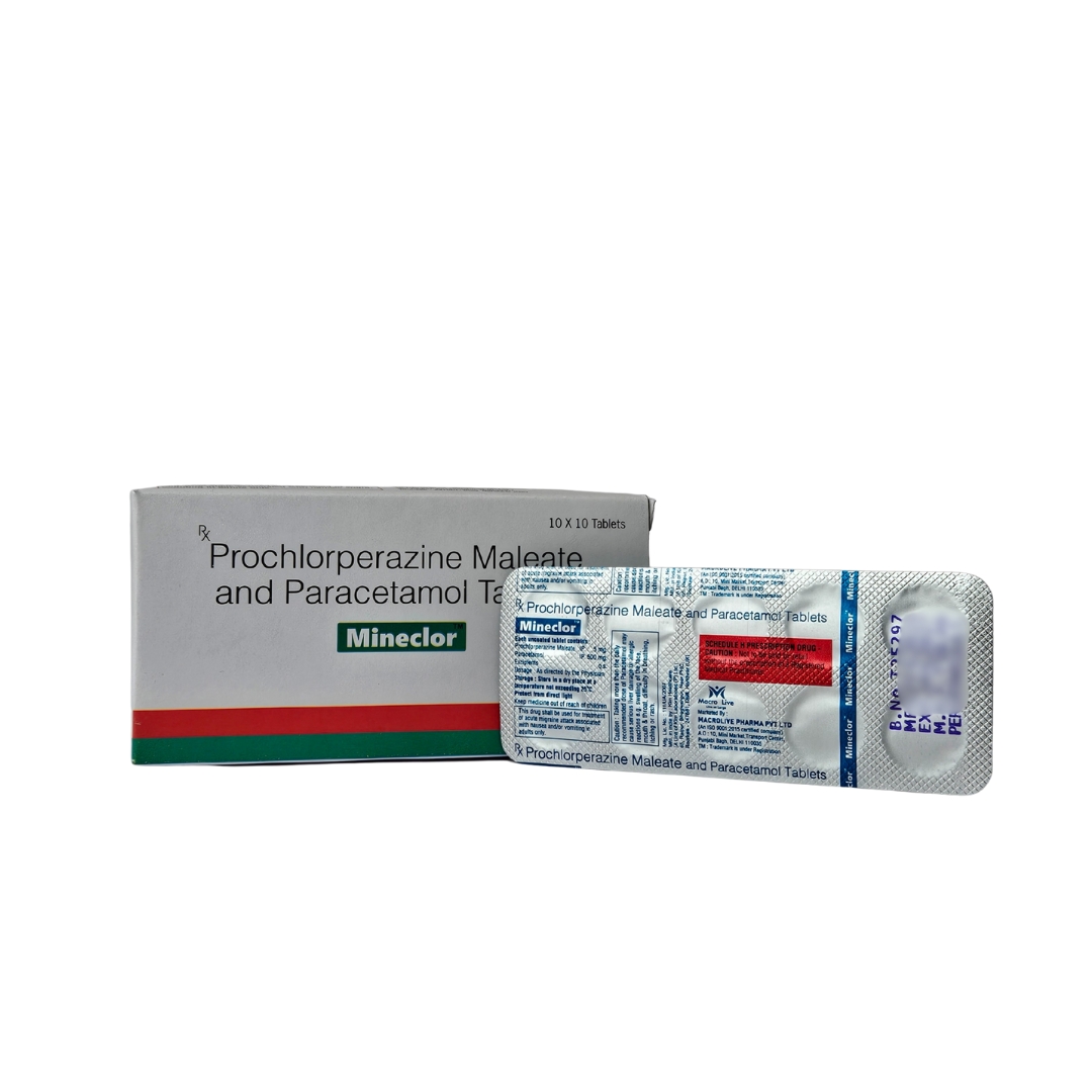Mineclor 500mg/5mg Tablet is a combination of two medicines: Paracetamol and Prochlorperazine which treat migraine. Paracetamol is an analgesic (pain reliever) and antipyretic (fever reducer). It works by blocking the release of certain chemical messengers that cause pain and fever. Prochlorperazine is an antiemetic (anti-nausea) medicine. It blocks the signals in the brain that cause nausea and vomiting associated with migraine.
